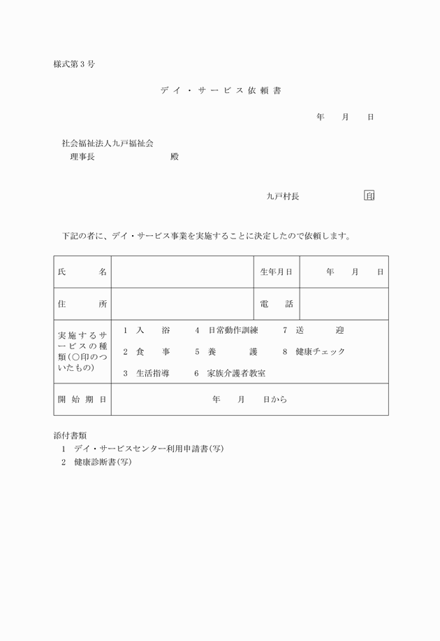 3 九戸福祉会は、前項の通知を受けたときは、デイ・サービス受諾書(様式第4号)を村長に提出するものとする。