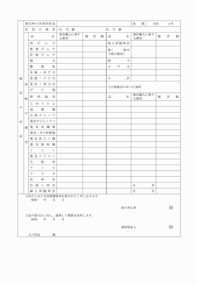 第4条 災害援護資金(以下「資金」という。)の貸付けを受けようとする者(以下「借入用込者」という。)は、次に掲げる事項を記載した借入申込書(別紙様式第1号)を村長に提出しなければならない。