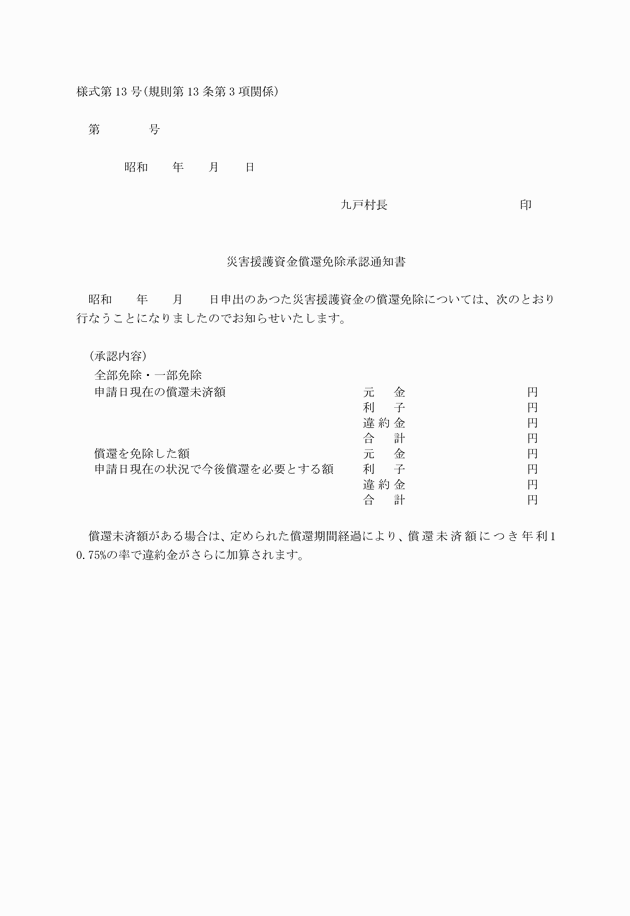第13条 災害援護資金の償還未済額の全部又は一部の償還の免除を受けようとする者(以下「償還免除申請者」という。)は、償還免除を受けようとする理由その他村長が必要と認める事項を記載した申請書(別紙様式第12号)を、村長に提出しなければならない。