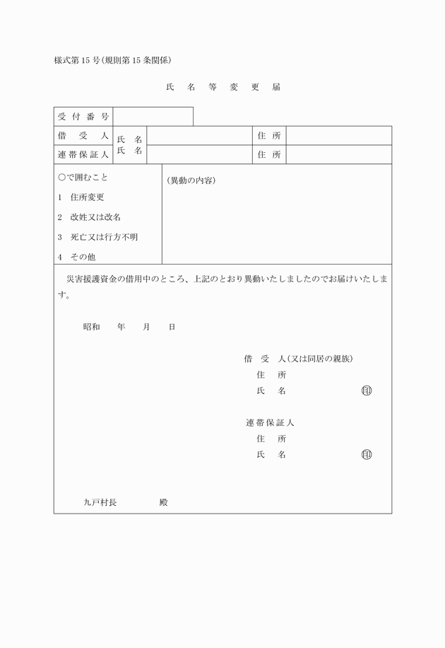 第15条 借受人又は保証人について氏名又は住所の変更等借用書に記載した事項に異動を生じたときは、借受人はすみやかにその旨を村長に氏名等変更届(別紙様式第15号)を提出しなければならない。ただし、借受人が死亡したときは、同居の親族又は保証人が代つてその旨を届け出るものとする。