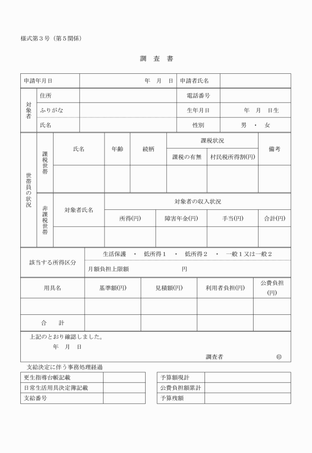 第5 村長は、第4の申請があったときは、速やかに調査書(様式第3号)を作成し用具の給付等の可否を審査しなければならない。