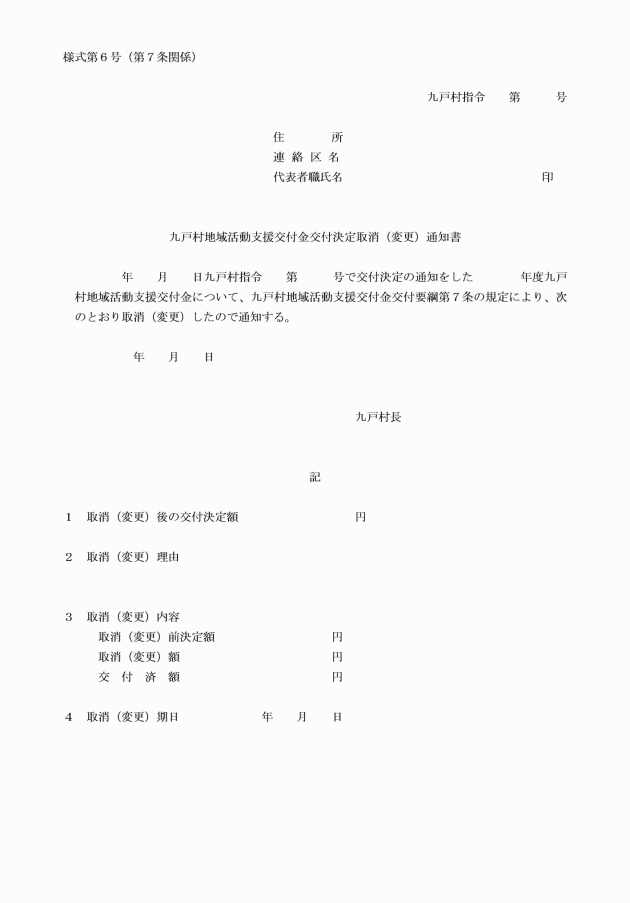第7条 村長は、対象となる連絡区が次の各号のいずれかに該当する場合には、交付金の交付決定の全部又は一部を取り消すことができる。